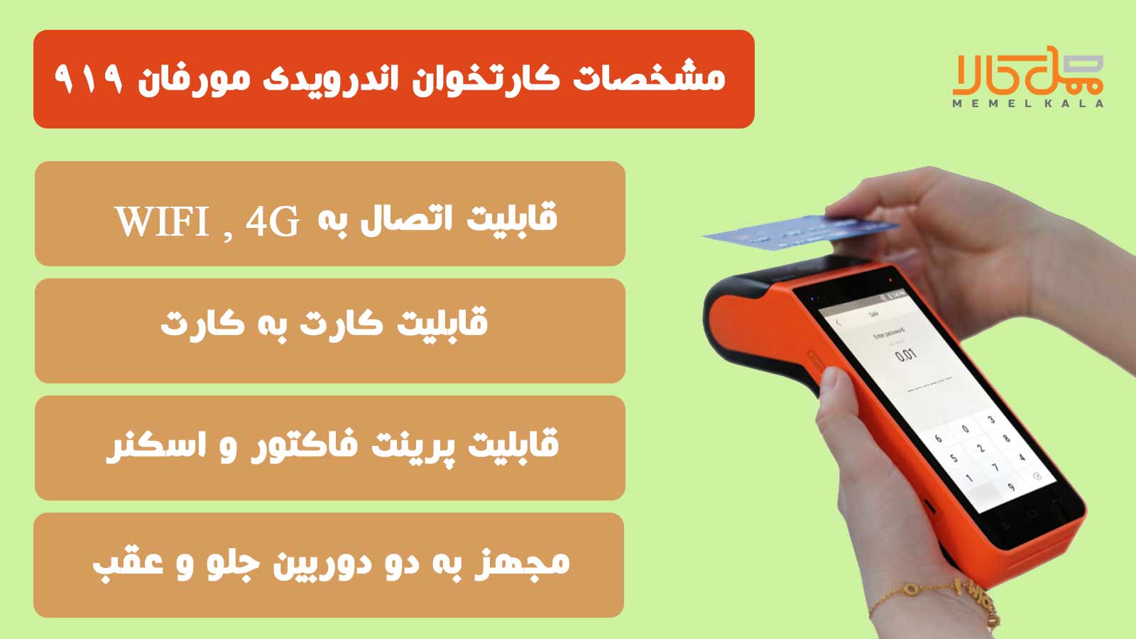 کارتخوان سیار مورفان 919 با طراحی مدرن و بسیار جذاب خود علاوه بر بهرهمندی از سختافزار پرقدرت به سیستمعامل اندرویدی نیز مجهز شده است. مورفان 919 با وجود صفحهنمایش بزرگ و حافظه داخلی و رم یک گیگابایتی یکی از بهترین دستگاه پوز های موجود در بازار بشمار میآید. همچنین لازم به ذکر است که کاغذ مورداستفاده در این مدل رول 58 میلیمتری است.